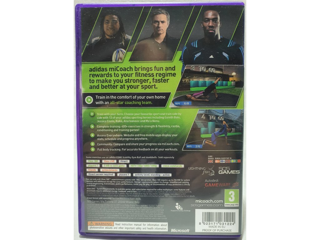 Adidas miCoach je dokonalý športový tréningový systém pre pohybové ovládanie. Môžete si zatrénovať po boku rôznych medzinárodne známych hviezd a pritom neustále dostávať spätnú väzbu. Systém miCoach sleduje všetky cviky a podľa ich kvality vás v hre odmeňuje. Všetky tréningové dáta sú k dispozícii kedykoľvek a kdekoľvek – na internetových stránkach miCoach, alebo na bezplatnej aplikácii miCoach pre mobilné telefóny. Môžete tak svoje výsledky zdielať, porovnávať s priateľmi a inými členmi komunity a získavať tak motiváciu k ich zlepšovaniu. V hre MiCoach si na svoje prídu ako nováčikovia, tak i ostrieľaní borci. Systém vám upraví tréningový program priamo na mieru a stanoví ciele podľa vašej zdatnosti a výkonov.
