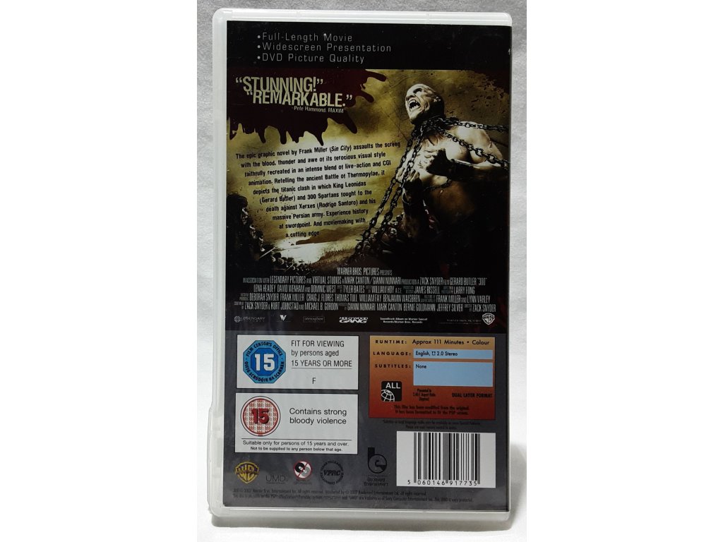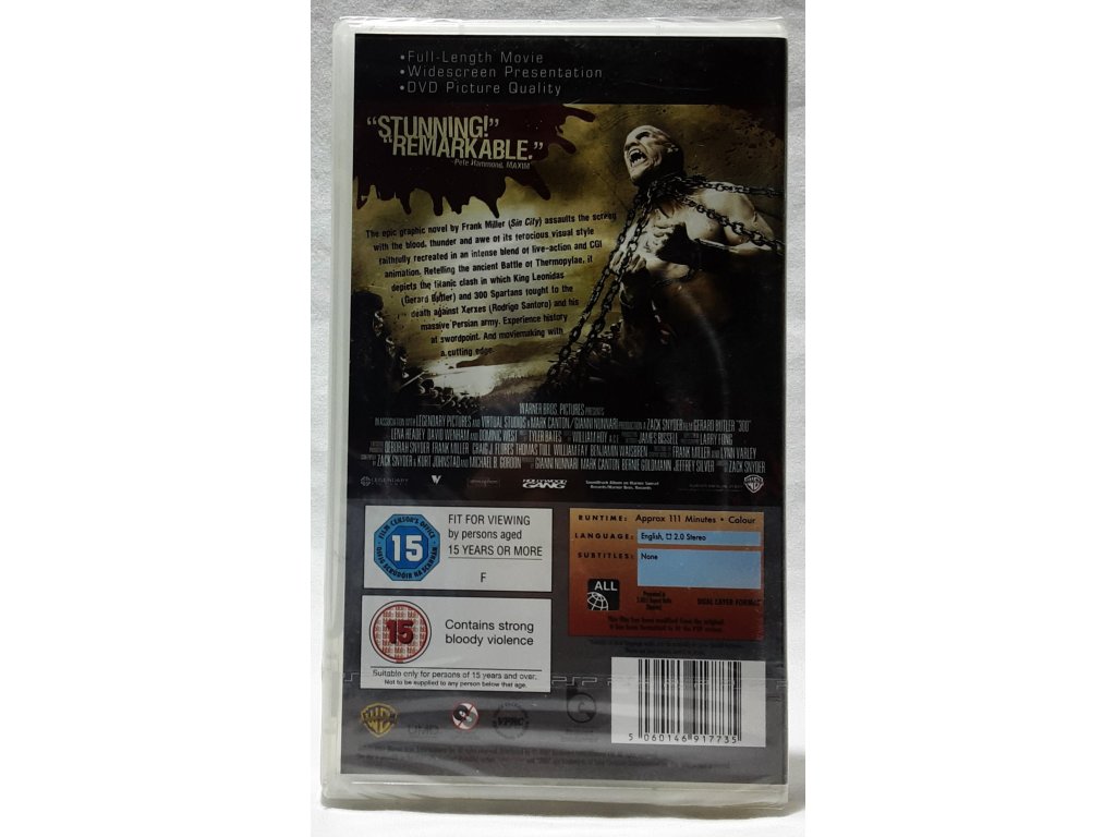 Toto je UMD pre PSP! Nie je to DVD. Rovnako ako Sin City pred ním, aj 300 živo oživuje grafický román Franka Millera a Lynn Varley. Gerard Butler vyžaruje čistú moc a charizmu ako Leonidas, grécky kráľ, ktorý vedie 300 svojich sparťanov (vrátane Davida Wenhama z Pána prsteňov, Michaela Fassbendera a Andrewa Pleavina) do bitky proti ohromnej sile perzských útočníkov. Ich jedinou nádejou je neutralizácia početnej výhody konfrontáciou Peržanov na čele s kráľom Xerxom (Rodrigo Santoro) pri úzkej úžine Thermopylae.