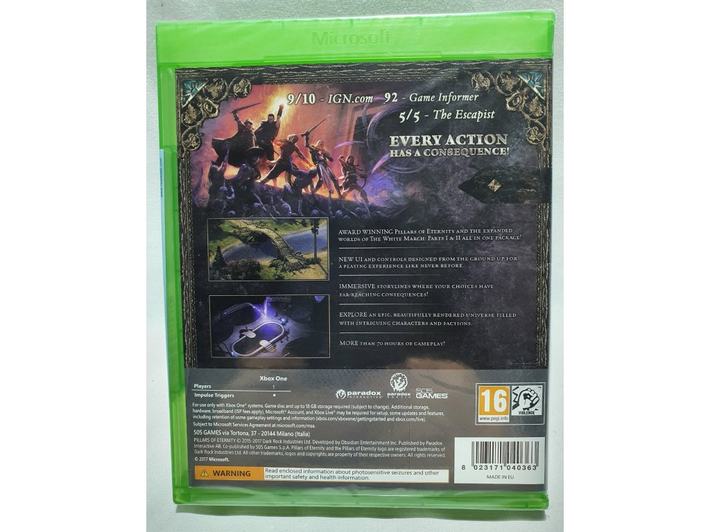 Pillars of Eternity: Complete Edition obsahuje všetok doposiaľ vydaný dodatočný obsah z PC verzie, vrátane všetkých DLC a prídavkov v jednom výhodnom balení. Pillars of Eternity, dokonalý zážitok s hrou na hrdinov na PC, teraz vychádza aj na Xbox One a PlayStation 4. Hru vyvinuli fanúšikovia hier na hrdinov z Obsidian Entertainment, majstri žánru RPG. Hra Pillars of Eternity začala ako projekt na Kickstarteri, kde s prehľadom naplnila všetky požadované ciele a prilákala cez 75 000 prispievateľov. Následne si vydobyla uznanie od médií, vyhrala desiatky cien a stala sa hitom na PC. Paradox Arctic aktuálne v spolupráci s 505 Games prinášajú fantastický svet, taktické súboje a nezabudnuteľný príbeh všetkým fanúšikom na úplne novú platformu.Dodatočné parametre