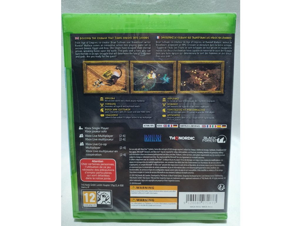 Od spolutvorca série Age of Empires, Briana Sullivana a autora Statočného srdca, Randalla Wallaca prichádza inovatívna akčná hra na hrdinov zasadená do starovekého Grécka, Egypta a Ázie. Titáni utiekli z večného väzenia a pustošia zem. Bohovia hľadajú hrdinu, ktorý dokáže zvrátiť priebeh tohto epického súboja, ktorý rozhodne o osude bohov a ľudí. Trúfaš si na túto neľahkú úlohu? U príležitosti desiateho výročia sa Titan Quest pochváli novým spracovaním. Táto Anniversary Edition obsahuje Titan Quest a Titan Quest Immortal Throne a dočkala sa aj nového prepracovania, ktoré prináša dokonalý zážitok všetkým fanúšikom ARPG HERNÝ OBSAH: Preskúmaj staroveký svet – Odhaľ záhadné tajomstvá na svojej výprave do legendárnych miest. Bojuj s legendárnymi príšerami – Proti mýtickým šelmám v príbehovej kampani, ktorá rozhodne o osude všetkého bytia. Uprav si svoju postavu – Vybuduj si a uprav postavy vďaka 28 triedam a viacej ako 1000 jedinečným a legendárnym predmetom a vytvor si dokonalého šampióna. Online hrateľnosť pre viacerých hráčov – Zober ostatných hráčov a užite si príbeh v dynamickej online kooperácii pre 2-6 hráčov. Ovládanie a rozhranie na konzolách – Na mieru šité rozhranie a ovládanie pre dokonalý zážitok ARPG na ovládači. Remástrovaná grafika – Kompletne prepracované textúry, ktoré ponúknu moderný zážitok s klasikou Titan Quest.Dodatočné parametre